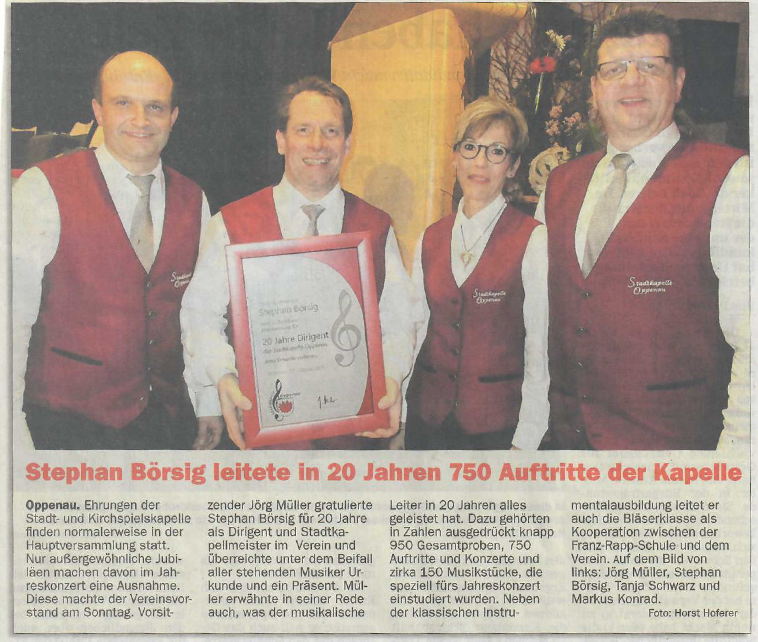 Oppenau. Ehrungen der Stadt- und Kirchspielskapelle finden normalerweise in der Hauptversammlung statt. Nur außergewöhnliche Jubiläen machen davon im Jahreskonzert eine Ausnahme. Diese machte der Vereinsvorstand am Sonntag. Vorsitzender Jörg Müller gratulierte Stephan Börsig für 20 Jahre als Dirigent und Stadtkapellmeister im Verein und überreichte unter dem Beifall aller stehenden Musiker Urkunde und ein Präsent. Müller erwähnte in seiner Rede auch, was der musikalische Leiter in 20 Jahren alles geleistet hat. Dazu gehörten in Zahlen ausgedrückt knapp 950 Gesamtproben, 750 Auftritte und Konzerte und zirka 150 Musikstücke, die speziell fürs Jahreskonzert einstudiert wurden. Neben der klassischen lnstrumentalausbildung leitet er auch die Bläserklasse als Kooperation zwischen der Franz-Rapp-Schule und dem Verein. Auf dem Bild von links: Jörg Müller, Stephan Börsig, Tanja Schwarz und Markus Konrad.